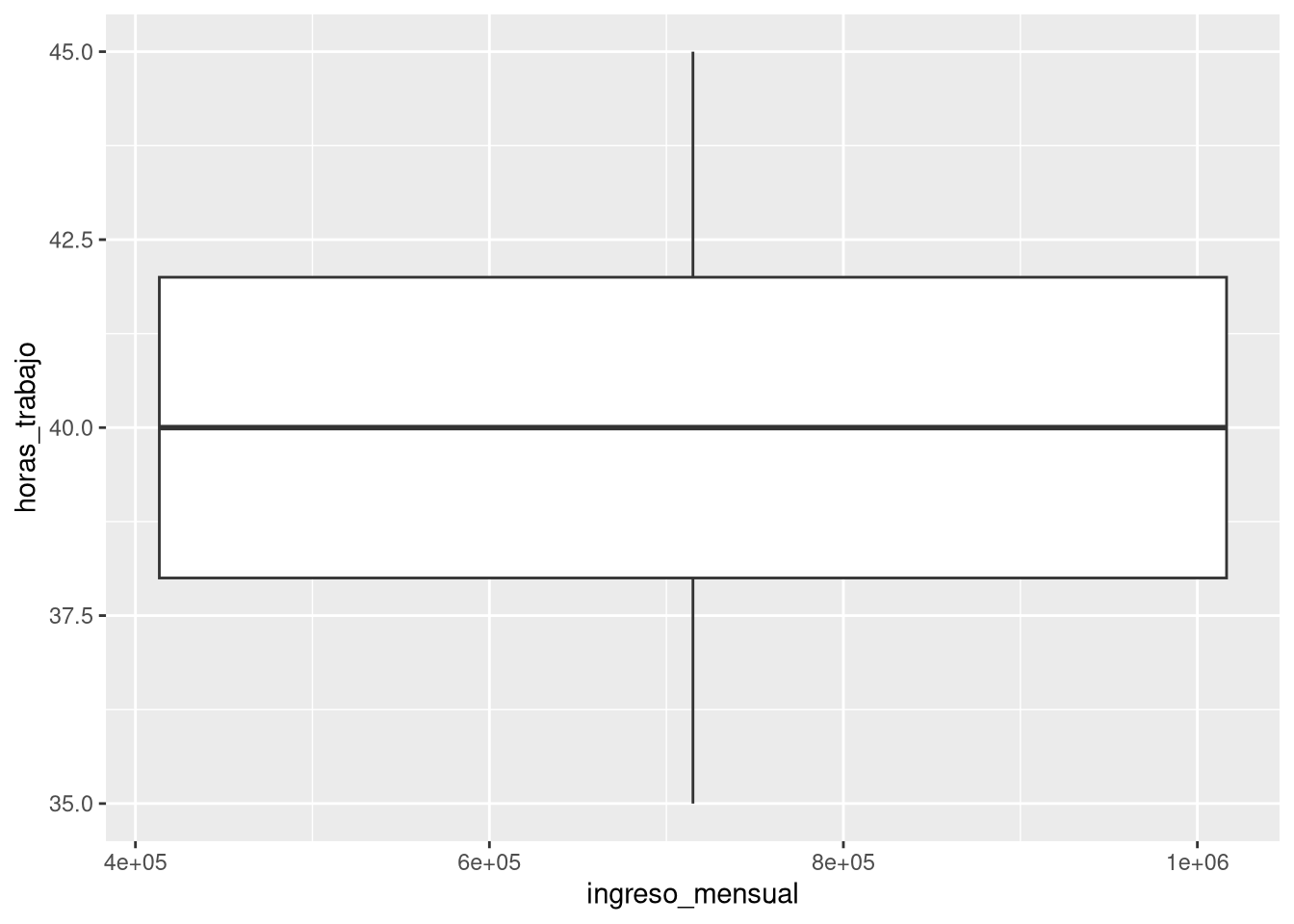 Finalmente, probemos un gráfico que no es apropiado para el tipo de variables que tenemos. Queremos relacionar ingreso mensual (numérica) con horas de trabajo (también numérica), pero usamos un geom_boxplot() que está diseñado para una numérica y una categórica: