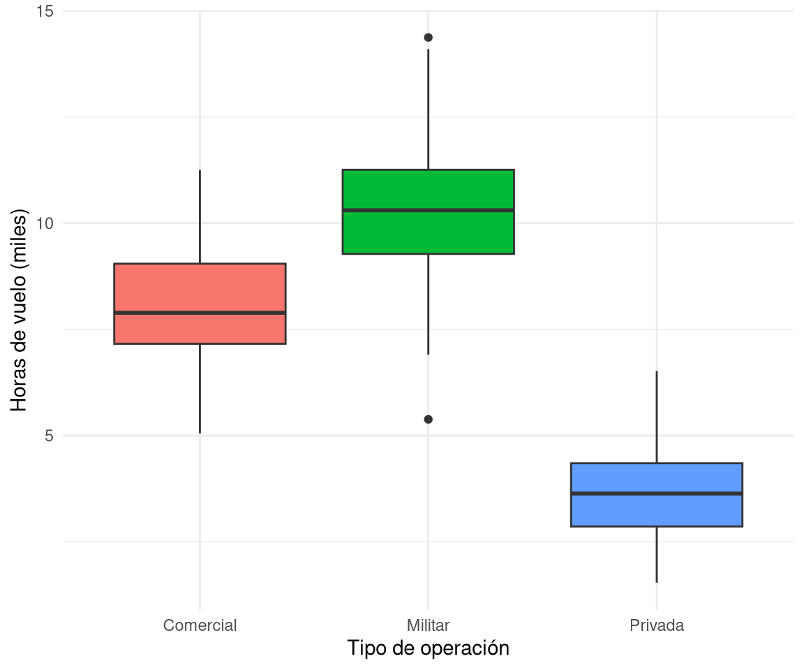 Ejemplo: Se desea comparar las horas totales de vuelo de pilotos comerciales según su lugar de entrenamiento (academia civil, fuerza aérea, escuela privada). Un box plot lado a lado mostraría rápidamente si la mediana de horas difiere entre los grupos y si algún grupo presenta valores extremos.