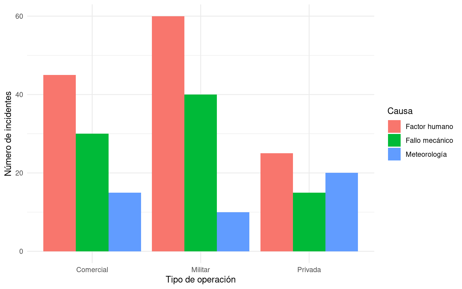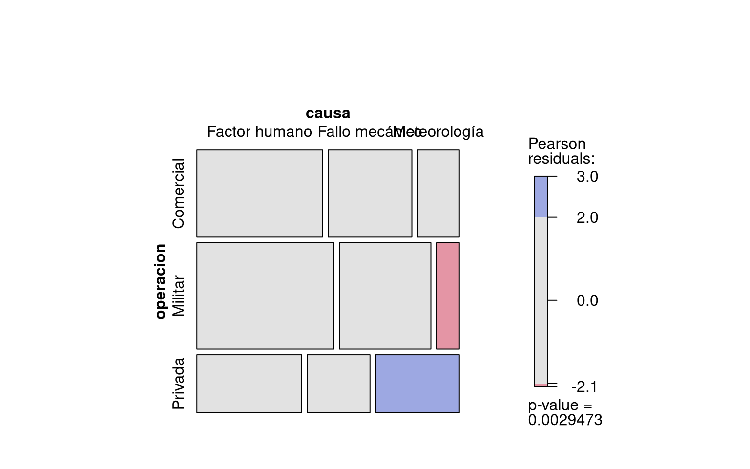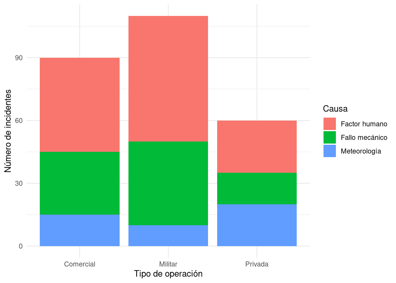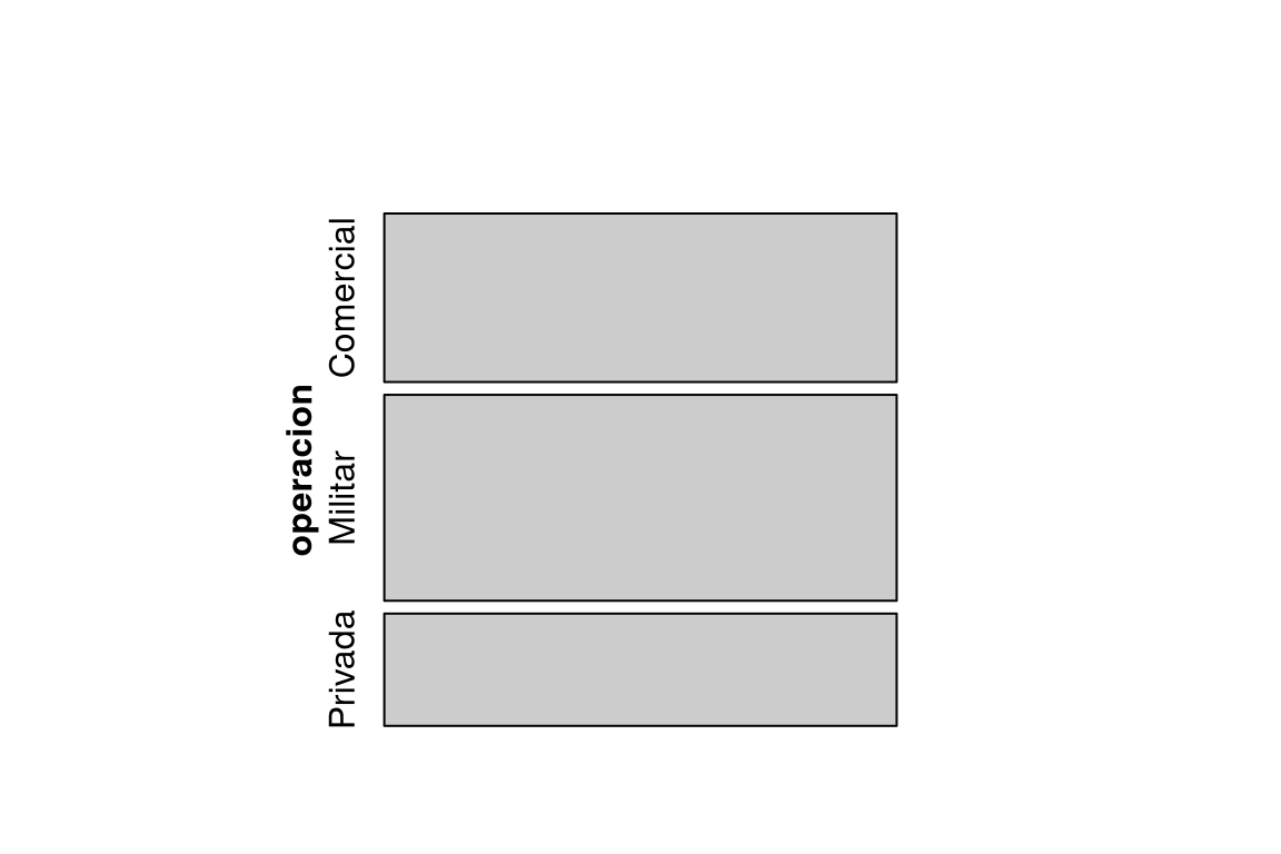 Gráficos de barras y mosaico En una investigación sobre incidentes en vuelo, se clasificaron 200 eventos según la causa principal (factor humano, fallo mecánico, meteorología) y el tipo de operación (comercial, militar, privada). Se quiere visualizar la asociación entre ambas variables.