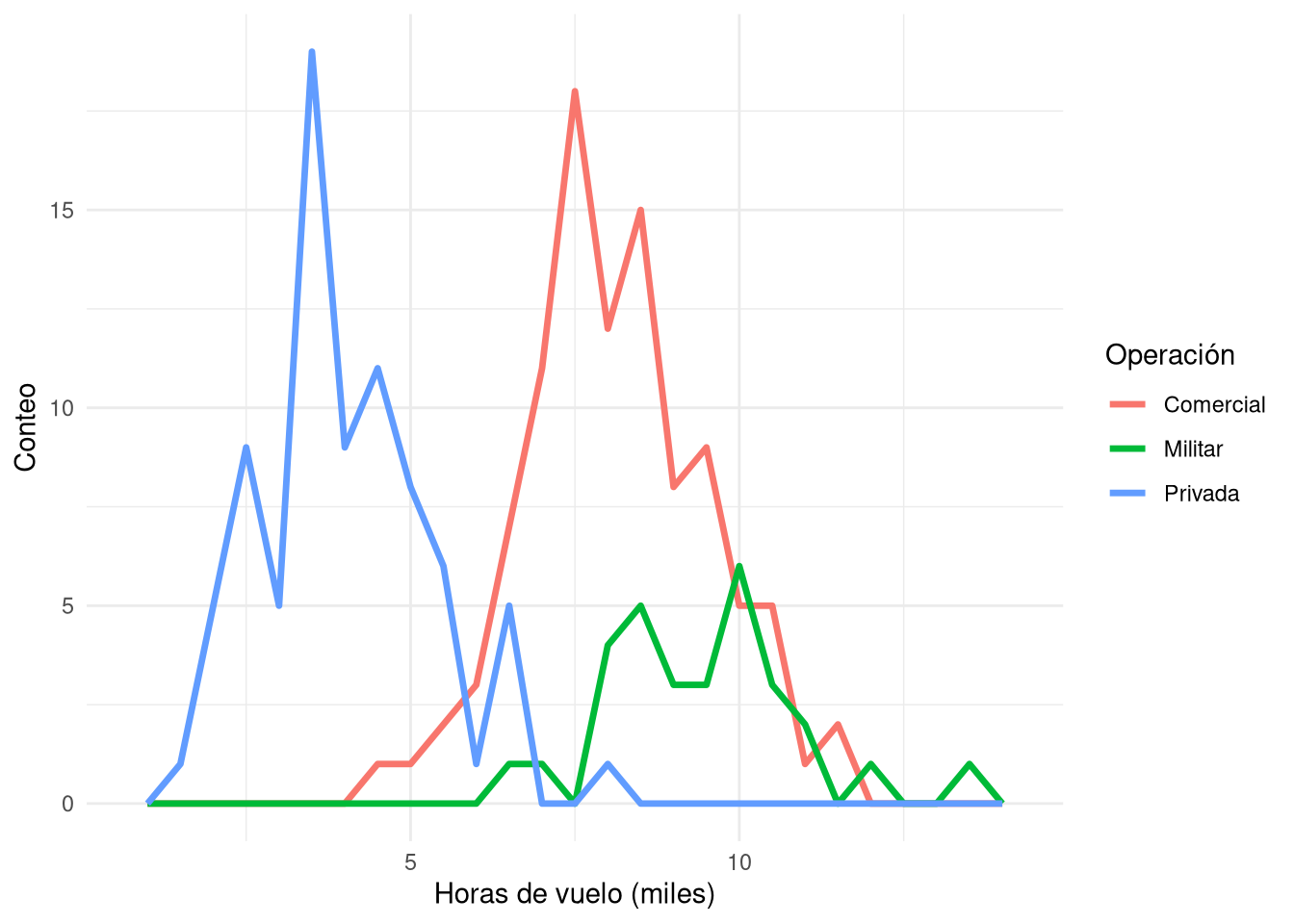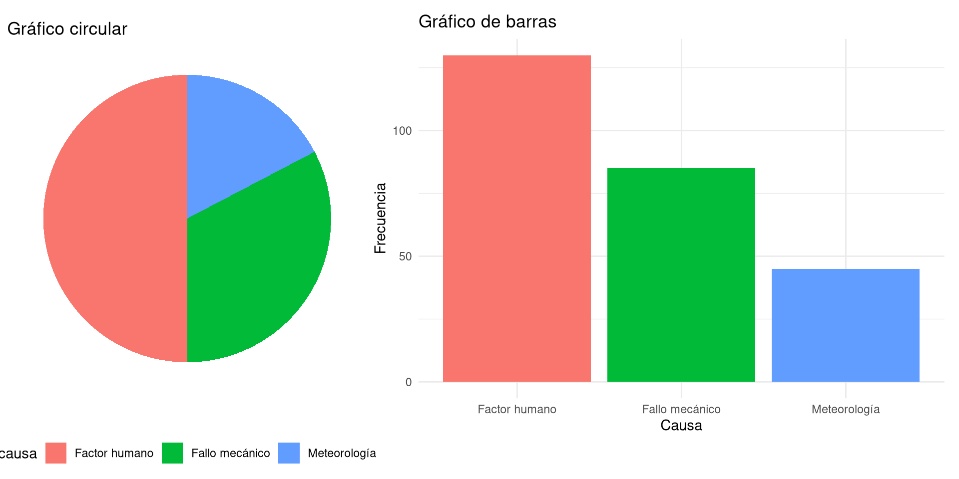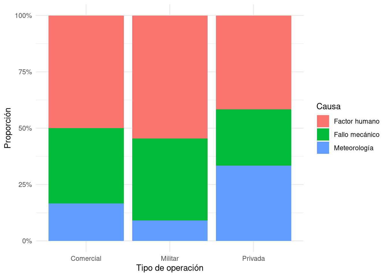Gráficos de barras y mosaico En una investigación sobre incidentes en vuelo, se clasificaron 200 eventos según la causa principal (factor humano, fallo mecánico, meteorología) y el tipo de operación (comercial, militar, privada). Se quiere visualizar la asociación entre ambas variables.