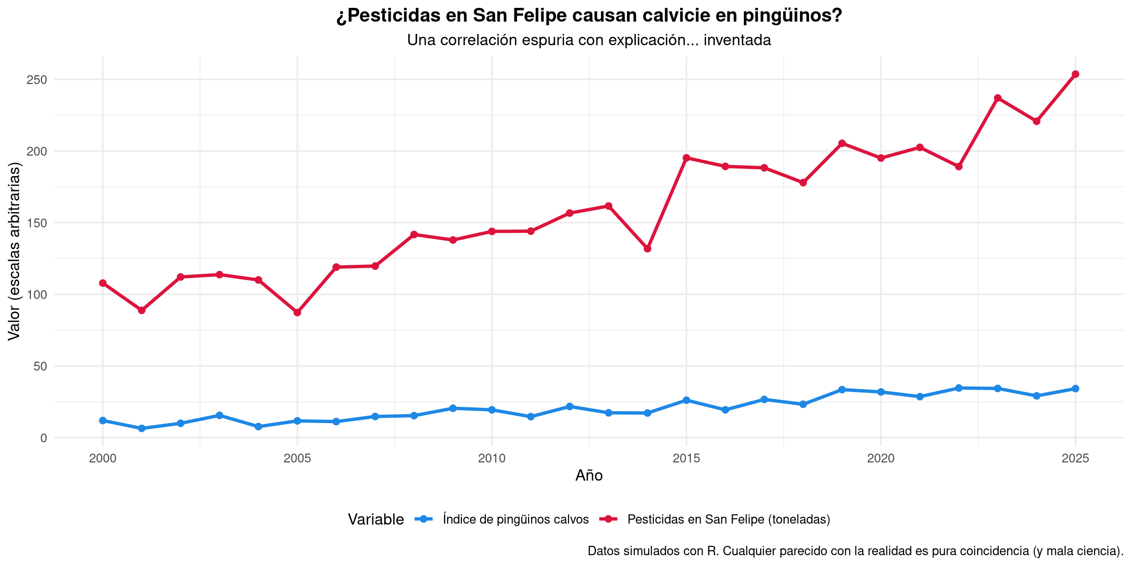 Para ilustrar esta profunda verdad científica, he generado unos datos con R. En el siguiente gráfico, la línea azul muestra las toneladas de pesticidas aplicadas en San Felipe (simuladas con una tendencia creciente y algo de ruido). La línea roja muestra el porcentaje de pingüinos con signos de calvicie observados en la Antártida (también simulados para que sigan el mismo patrón).